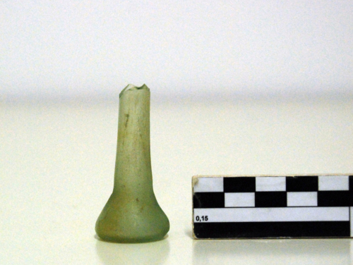 Balsamario con lungo collo cilindrico, sottolineato alla base da una strozzatura, con basso corpo troncoconico e base leggermente concava.