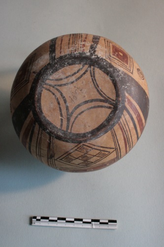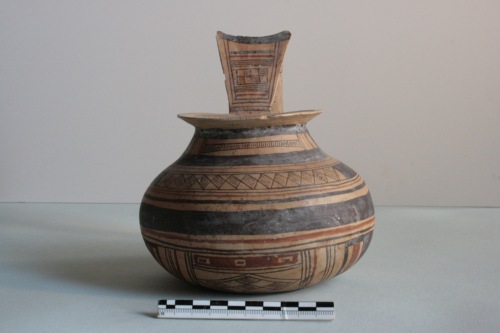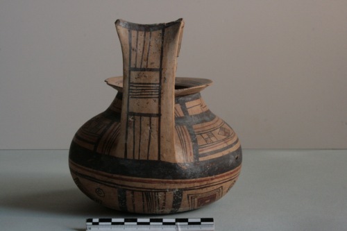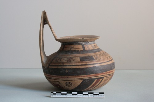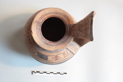 Brocca geometrica daunia a decorazione bicroma in argilla crema chiaro e superficie più scura. L'ansa è a gomito con sella, l'imboccatura ad ampio orlo, il corpo emisferico schiacciato ai poli. Il vaso è apode. Decorazione in marrone scuro e rosso mattone: vicino all'imboccatura è presente una linea rossa, due linee brune a cui seguono una serie di raggi; sull'ansa, sopra l'attacco superiore, sottili linee alternate rosse e brune, con motivo a scacchiera al centro, la sommità a sella è coperta di bruno, nella parte posteriore, motivi a sottili righe verticali brune con una fascia al centro a righe orizzontali; sul collo motivo a trattini verticali e a linee spezzate tra le due fasce brune; sul corpo larga fascia bruna con al centro motivo a rombi riempiti di puntini e uniti per il vertice e, ai lati, motivo a scacchiera rosso e bruno, segue una larga fascia bruna tra linee più sottili rosse e brune; nella parte inferiore del corpo sul davanti un rombo decorato a scacchiera tra fasci di linee diagonali rosse e brune, ai lati rombi contornati da linee brune e affiancati da cerchiolini; sotto l'ansa fasci di linee rosse e brune verticali; sul fondo doppio rombo a lati concavi iscritto in un'ampia fascia bruna circolare. Rovinata da qualche sbrecciatura sull'orlo e da diffuse incrostazioni superficiali.