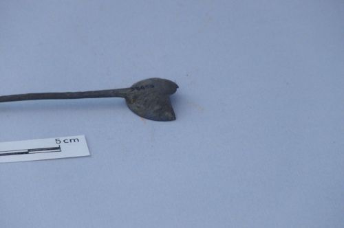 sottile manico a sezione circolare e terminazione assottigliata; vasca circolare poco profonda, decorata all'esterno da una costolatura a V in corrispondenza dell'attacco del manico