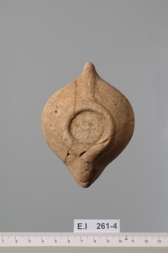 La spalla estroflessa, è ornata da quattro file di perline rilevate e mal sagomate; il disco piccolo e lievemente concavo, è delimitato da un anello in rilievo e reca un grande infundibulum leggermente decentrato verso l?alto. L?ansa, decorata da tre scanalature, presenta un rozzo tentativo di incisione ed è opposta al grande becco completamente occupato dal foro di bruciatura. La base, piatta, è racchiusa da un cordolo che continua con una nervatura fino all?ansa. Corpo ceramico depurato di color nocciola chiaro.