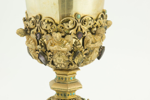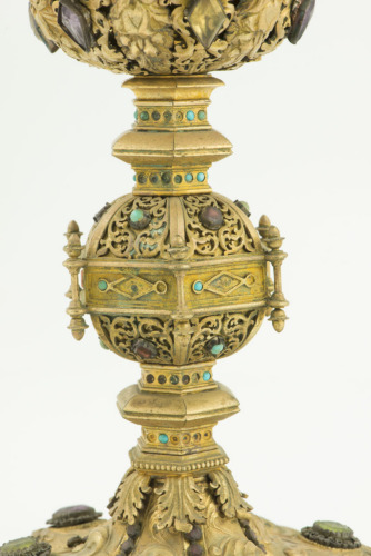 Piede sagomato a sei lobi a punta, decorato con motivi vegetali e pietre preziose incastonate al centro di ogni lobo. Nodo sferico, raccordato a piede e coppa da elementi esagonali, in parte ornati da pietre, decorato a tralci vegetali e pietre incastonate, con fascetta centrale esagonale ornata con motivi geometrici e pietre, ai cui angoli sono collocate delle colonnine coronate da elementi a ghianda. Coppa campaniforme con sottocoppa decorata a traforo da quattro angeli oranti in rilievo fra tralci vegetali alternati a pietre incastonate di varia forma