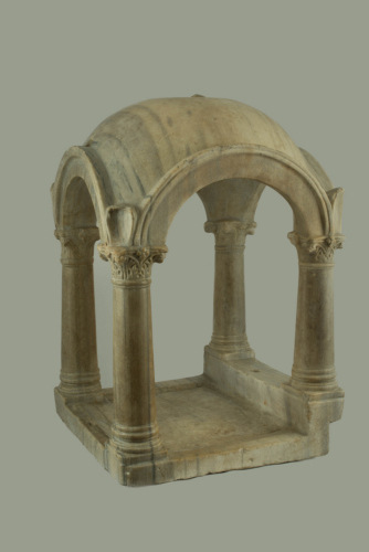 Base quadrangolare con bordo posteriore leggermente rialzato. Al di sopra ai quattro angoli si trovano quattro colonne con capitelli a foglie d'acanto. Sulle colonne si imposta una volta a vela. Ad ogni angolo si trova una foglia concava liscia come acroterio. Sull'estradosso dell'arco di prospetto e in quello a sinistra è incisa un'iscrizione. All'interno della cupola al centro vi è un maschio di marmo con un foro