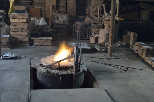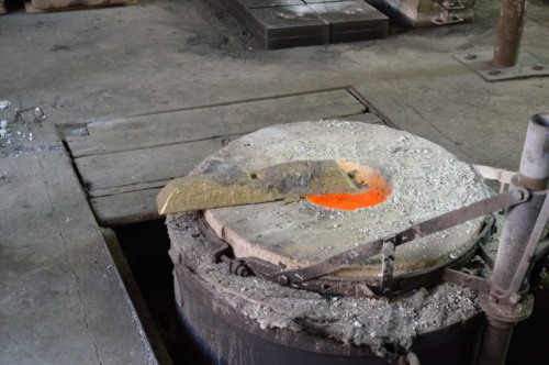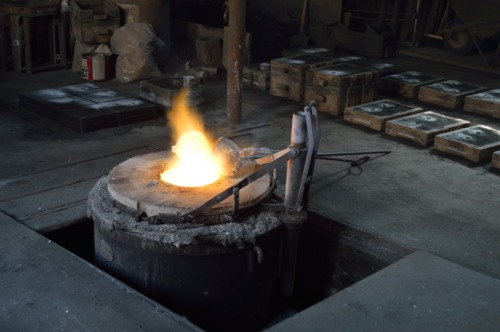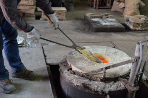 La fusione avviene inserendo all'interno del forno a crogiolo in grafite i lingotti ad uno ad uno. La quantità da inserire dipende dal numero e dalla grandezza degli stampi da realizzare; in questo caso sono stati utilizzati 140 kg di ottone. Il metallo viene fuso a una temperatura di 950°-1000°; la temperatura è più alta lo facciamo caldo caldo caldo , se i pezzi da fondere sono pezzi fini, mentre se i pezzi sono più grandi serve un un po più freddo.