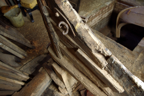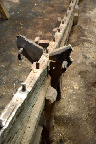 Roberto Tramontin: L'asimmetria è data dal cantiere (intende #cantier# matrice). Il prossimo due febbraio ha cento e trenta anni. Ma è molto disteso. Nel senso che la gondola nasce così poi viene curvata. Altri invece la fanno già curvata molto più... nasce già storta. Diciamo che si può fare, ma diventa standard (...). A proposito del discorso dello sbandamento. Vedi che qui ho una curva X (si riferisce allincrinatura delle ordinate) inventata da mio bisnonno e ognuna cambia. È una parabola (G. Penzo parla di sinusoide) perfetta, caso strano lha fatta ad occhio e Gilberto Penzo l'ha misurata ed è perfetta. Con questo giro riesco a far sbandare la barca senza che la gondola capotti, non scuffia. Gli altri cantieri raddrizzano questo qua, avendo il compensato non riescono a fare questa curva, è troppo curva. Allora raddrizzando qua diminuisce l'angolo di sbandamento. Anche se premono, la barca raggiunge un angolo e da lì non si sposta. Invece la mia va giù finché #no se rabalta#. È un vantaggio per loro (gondolieri).