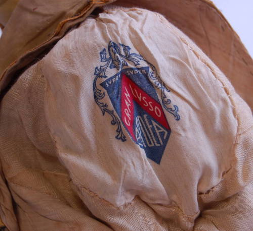 fasce di stoffa gialle e verdi (due per lato) decorate da una fettuccia con filamenti dorati sovrapposta alle cuciture laterali e la bordatura inferiore. Corno riempito di ovatta e piegato in avanti. Piccolo spacco sul retro. Ai lati ci sono due grandi bottoni #botòi# rivestiti in stoffa dai quali partono due fasce (a destra rossa e a sinistra gialla)decorate anch'esse con la stessa fettuccia. Fodera in cotone bianco tranne dietro i bottoni dove è in cotone rasato lilla. Al centro della fodera è stata cucita una stoffa con disegnato il marchio del cappello dal quale è stata riciclata. Il berretto viene fissato alla testa grazie ad un elastico.Notizie storico-critiche