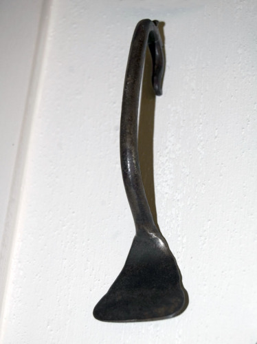 oggetto in ferro composto da un manico molto arcuato e terminante ad un'estremità con un uncino e all'altra con una palettina a forma pressoché triangolare e leggermente rialzata.Notizie storico-critiche