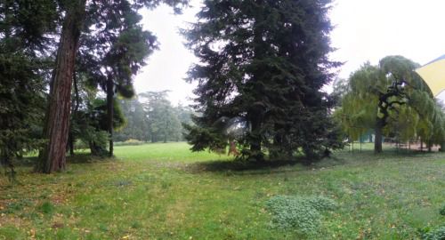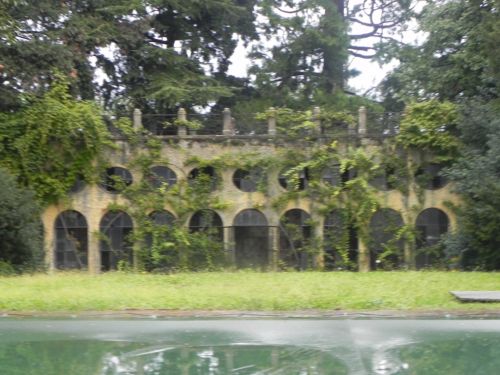 Il giardino di fronte alla villa si raccoglie tra le due barchesse che affiancano perpendicolarmente il corpo padronale, concludendosi con una peschiera che fronteggia l’area di pertinenza residenziale della villa come un vecchio fossato medioevale. Questa attraversata da un ponte prospiciente il portale d’ingresso collega lo stesso giardino ad un esedra verde rinchiusa da un perimetro in siepe con un altro portale in linea con il precedente. L’altra zona raccolta all’interno del complesso edilizio e la corte rurale ad est del corpo padronale circondata dai vecchi fienili e stalle della villa. Nel retro della villa si estende un parco all’inglese con percorsi sinuosi e gruppi di alberi raccolti, delimitato da un alto recinto in muratura e sasso che lo divide ad nord ed ad ovest da terreni prevalentemente agricoli e da tracce di vecchia recinzione ad est che lo separa dal vigneto. Nella parte più settentrionale del parco è presente una serra con dei rilievi che la fiancheggiano percorsi da un sentiero che ne conduceva in sommità della stessa creando una pregevole postazione di belvedere. La parte che costeggia con un muro alto ad ovest della villa, la strada pubblica e destinata ad orto con l’inserimento di vari edifici ad utilizzo agricolo.