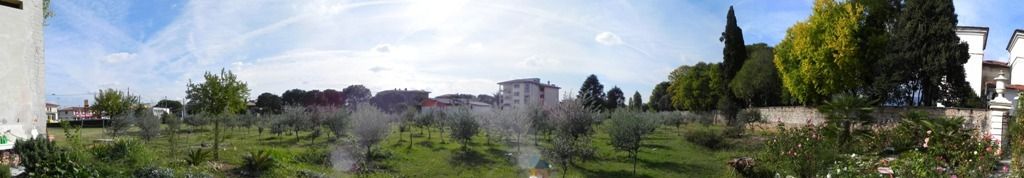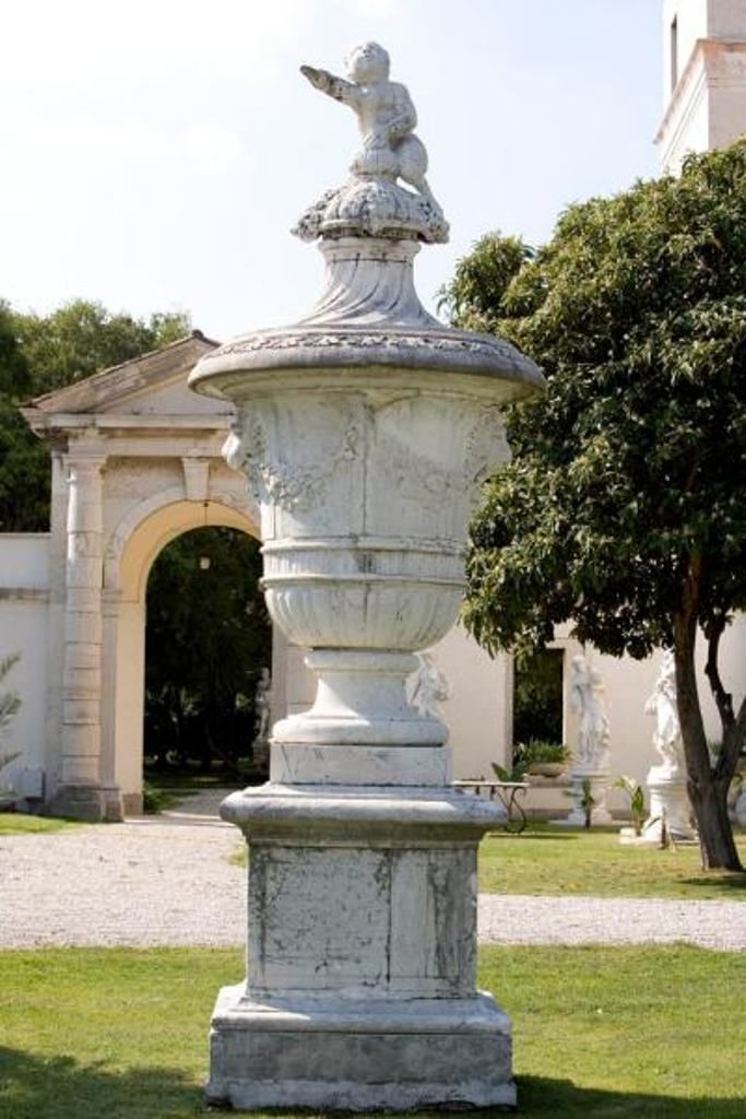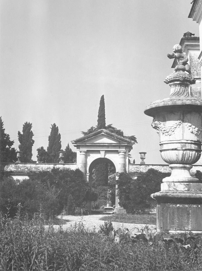 La particolare morfologia del complesso configura una nitida corte-giardino di forma rettangolare collocata davanti alla facciata principale della villa rivolta ad est verso la strada; ai lati nord e sud la corte è delimitata da due corpi porticati di simili fattezze, in corrispondenza dei quali sono posti due ingressi laterali e simmetrici. Aldilà della sede stradale la corte-giardino trova completamento in un’ampia esedra semi-ellittica, che conserva al centro i pilastri della cancellata d’ingresso alla campagna. A nord, aldilà del corpo porticato, si apre l’antica corte rurale. In corrispondenza del fronte posteriore della villa, rivolto ad ovest, si apre un ampio giardino piantumato e delimitato da alte murature in sasso e mattoni; ai lati del giardino si estende a meridione un’area agricola con piantumazioni di ulivo, mentre la parte a nord, di fronte agli annessi rustici, è mantenuta a prato.