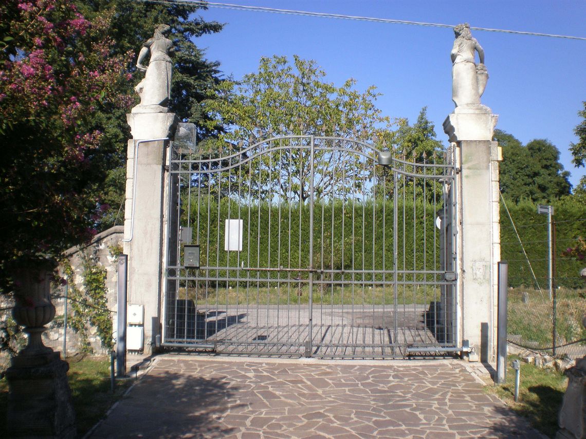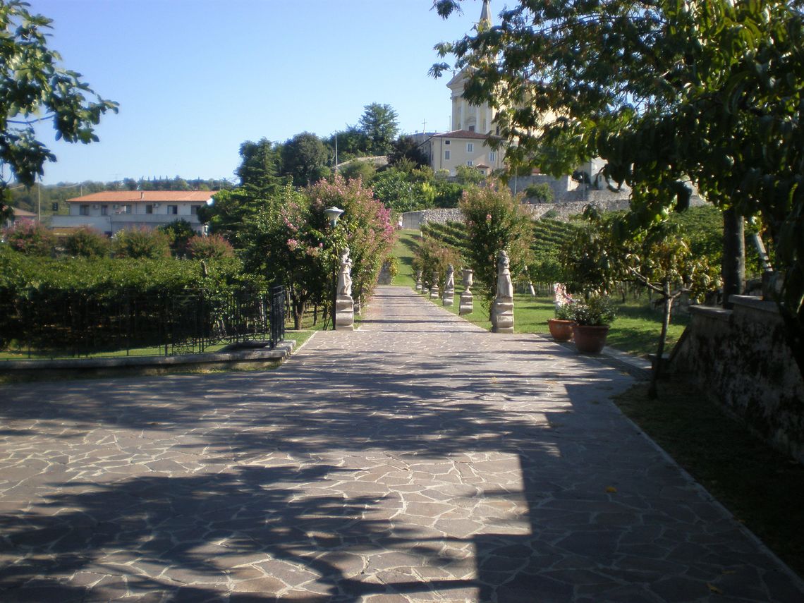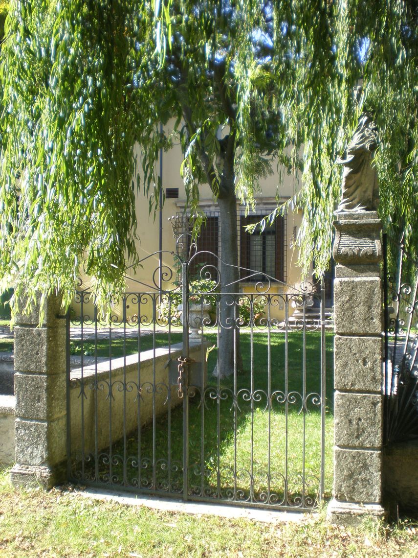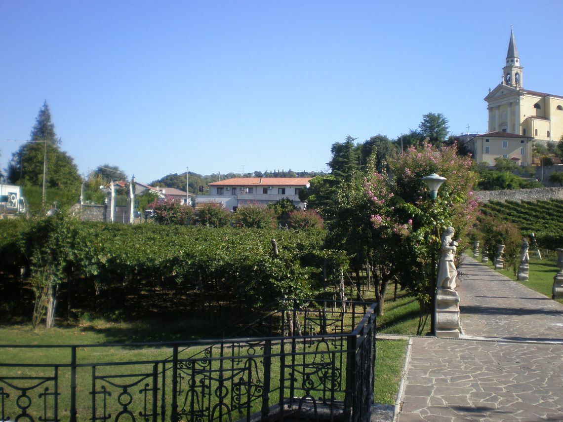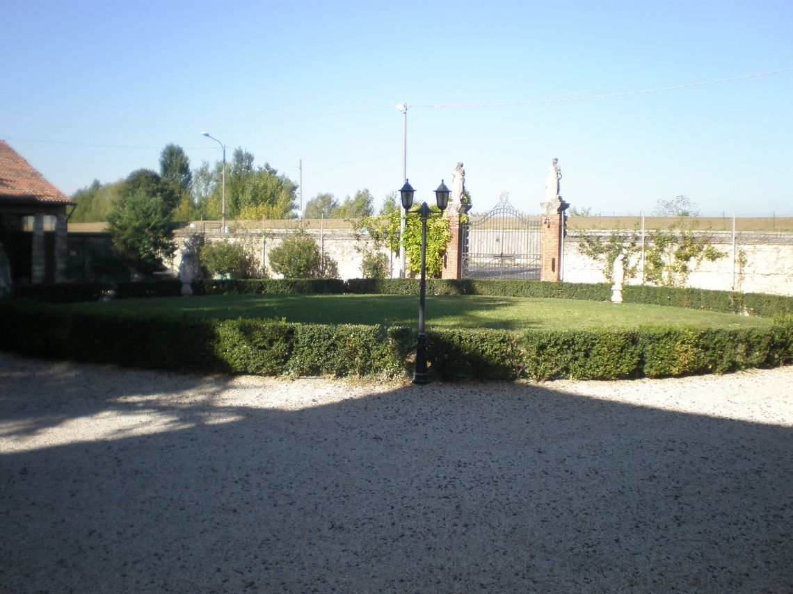 L'ampia area verde presenta una forma irregolare e occupa per intero il lotto di pertinenza del complesso che si sviluppa lunga l'antica sede stradale. Essa si differenzia in quattro settori: la corte interna (map. 121), il giardino antistante la villa (map. 119), il frutteto (map. 246) e i campi coltivati a vigneto. L'area è racchiusa da un muro in pietra. Nel corso dei secoli la proprietà è stata frazionata riducendo il contesto originario.