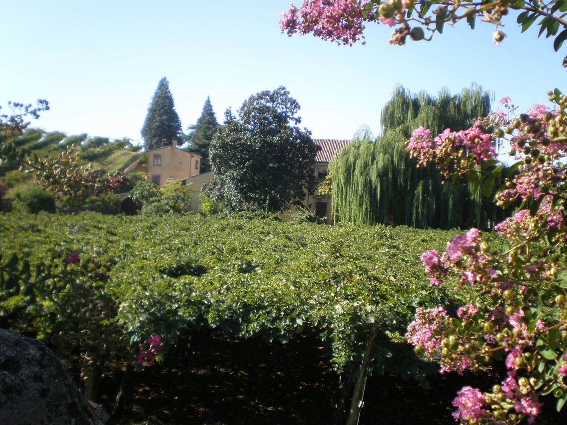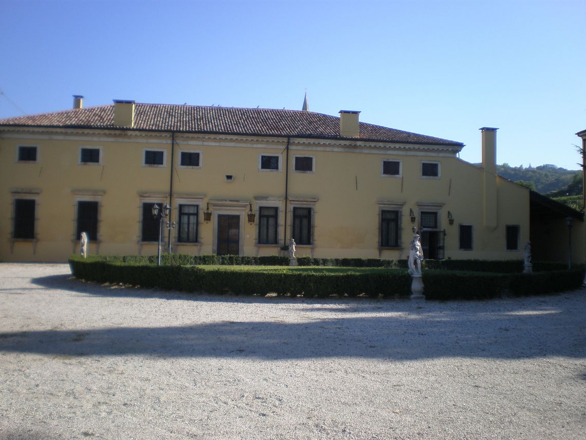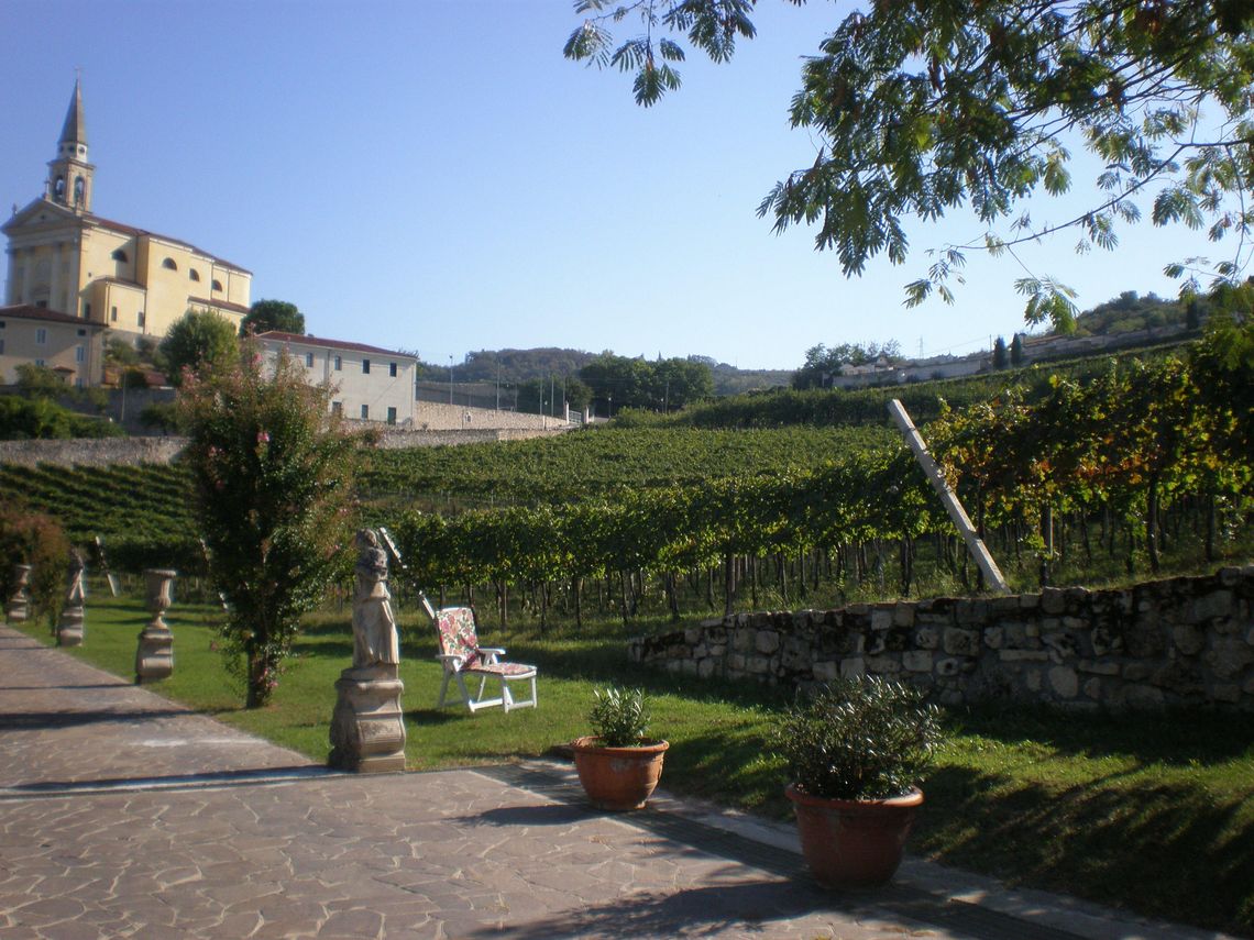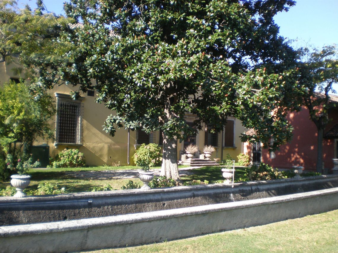 L'ampia area verde presenta una forma irregolare e occupa per intero il lotto di pertinenza del complesso che si sviluppa lunga l'antica sede stradale. Essa si differenzia in quattro settori: la corte interna (map. 121), il giardino antistante la villa (map. 119), il frutteto (map. 246) e i campi coltivati a vigneto. L'area è racchiusa da un muro in pietra. Nel corso dei secoli la proprietà è stata frazionata riducendo il contesto originario.