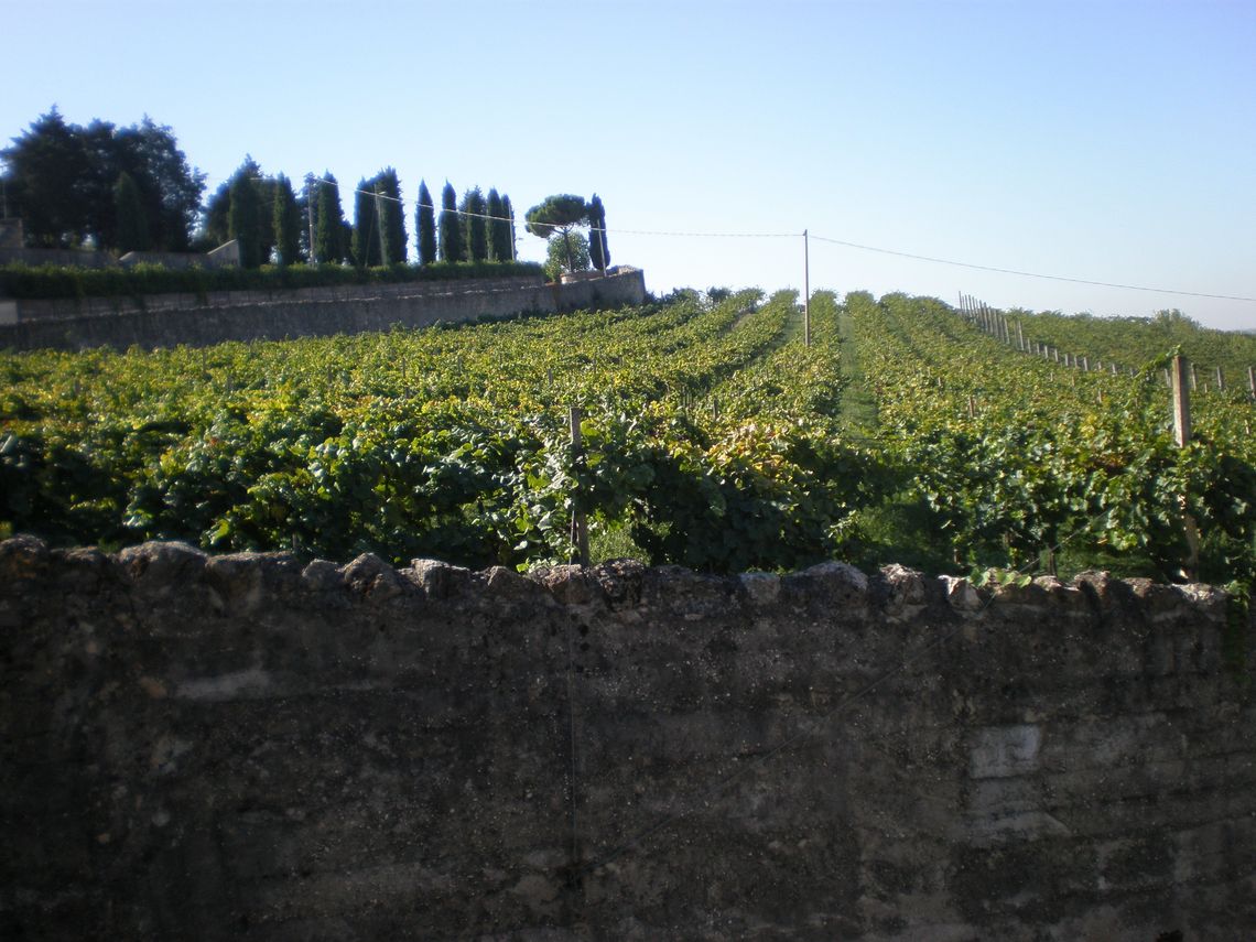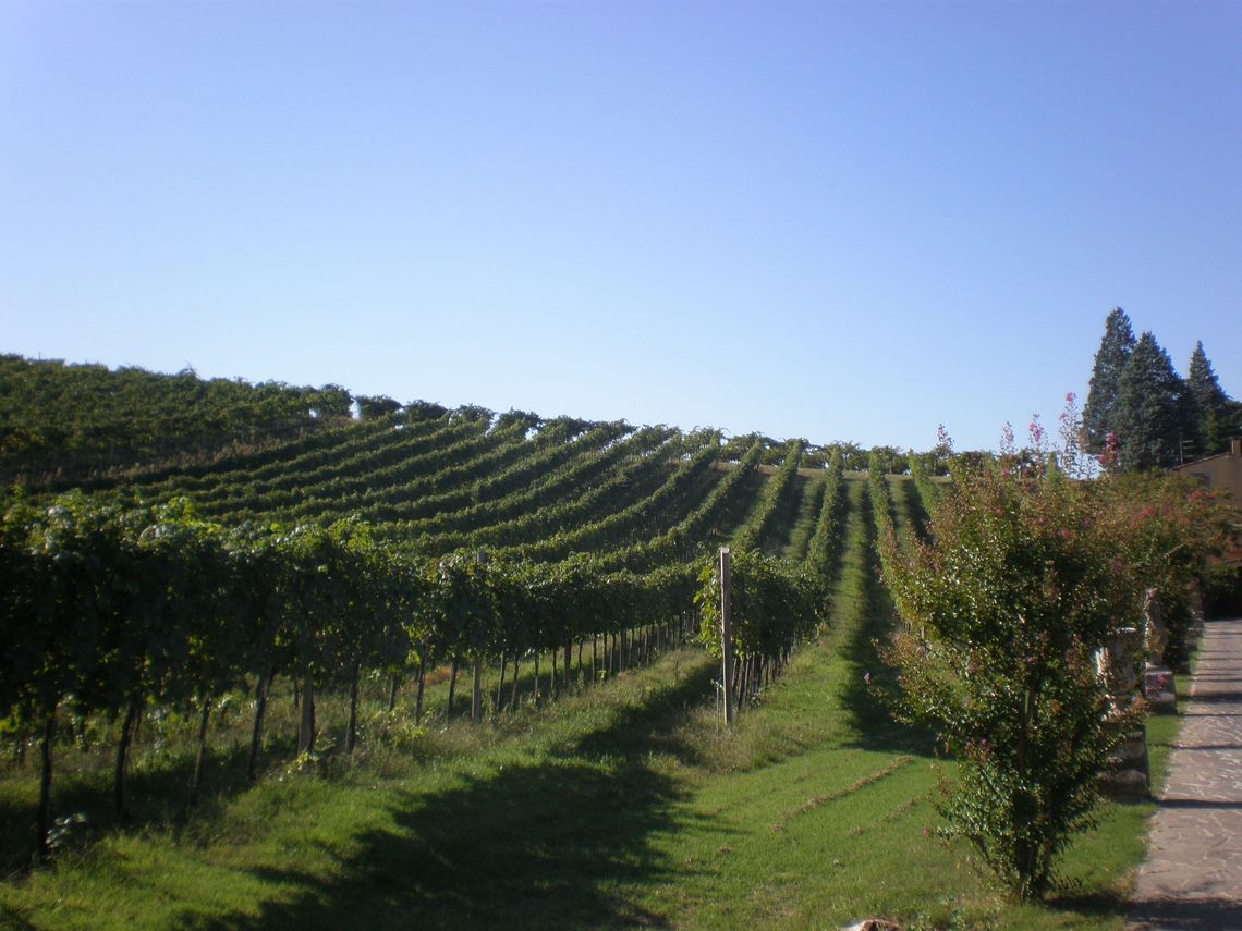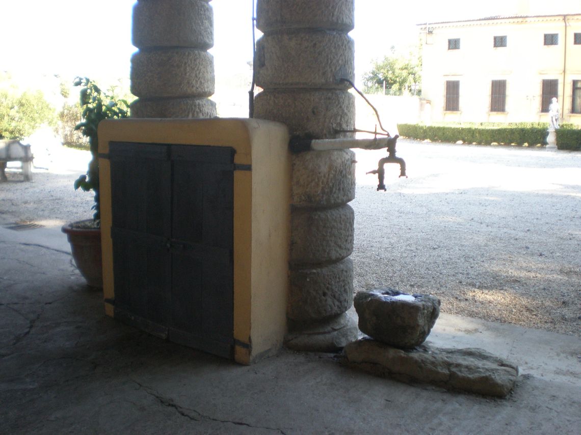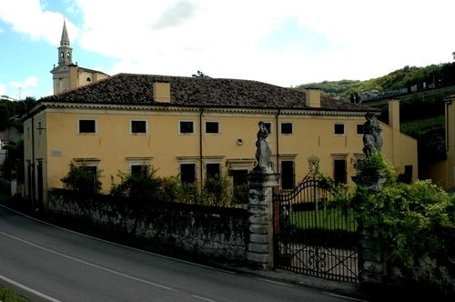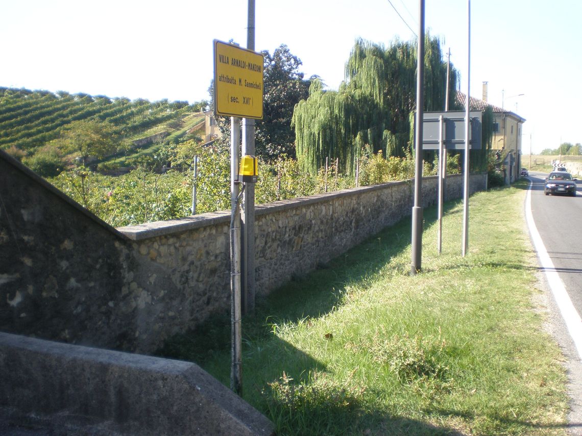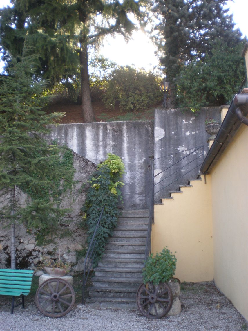 L'ampia area verde presenta una forma irregolare e occupa per intero il lotto di pertinenza del complesso che si sviluppa lunga l'antica sede stradale. Essa si differenzia in quattro settori: la corte interna (map. 121), il giardino antistante la villa (map. 119), il frutteto (map. 246) e i campi coltivati a vigneto. L'area è racchiusa da un muro in pietra. Nel corso dei secoli la proprietà è stata frazionata riducendo il contesto originario.