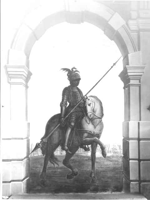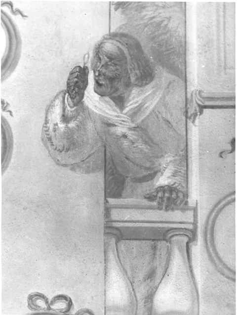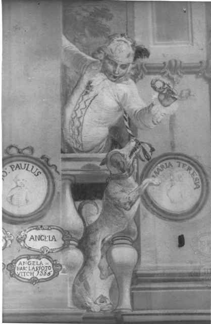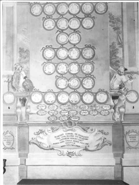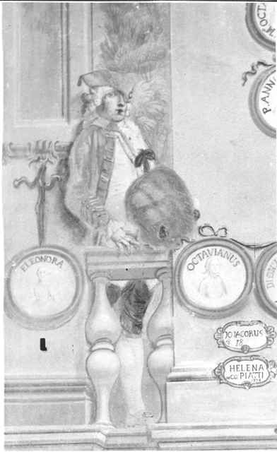 - Descrizione: volte e pareti della loggia al piano terra e al primo piano con accurati motivi architettonici a volte sostenute da paraste, che inquadrano ritratti di famiglia e un albero genealogico