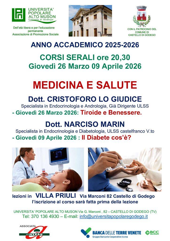 L'Università Popolare Alto Muson di Castelfranco Veneto è lieta di presentare il ciclo di lezioni intitolato "Medicina e Salute", che si terrà nei mesi di marzo e aprile 2026. Questo corso è pensato per offrire informazioni utili e pratiche sulla salute e il benessere, grazie alla partecipazione di esperti del settore medico.