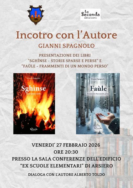 Venerdì 27 febbraio alle 20:30 presso la sala conferenze dell'edificio delle "ex scuole elementari" ad Arsiero si terrà l'incontro con l'autore Gianni Spagnolo.