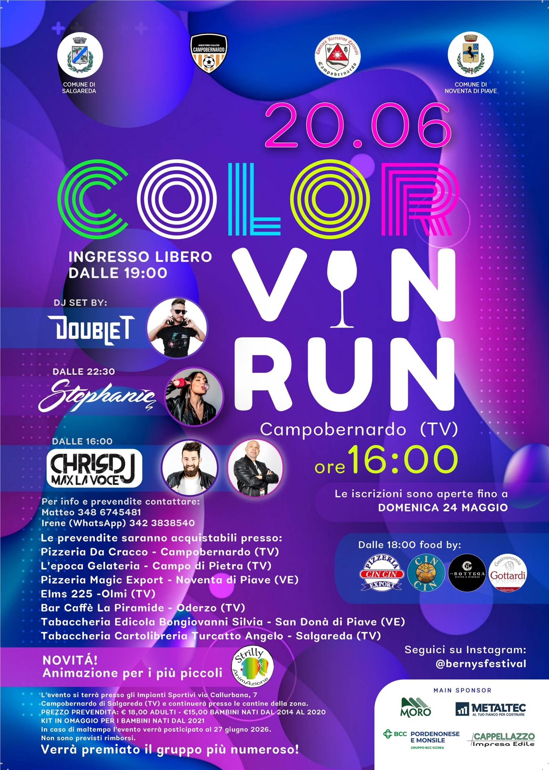 Sabato 20 giugno 2026, presso gli impianti sportivi di Campobernardo di Salgareda, si svolgerà la manifestazione “Color Vin Run 2026”, una giornata all’insegna dello sport, della musica e del divertimento aperta a tutta la cittadinanza.