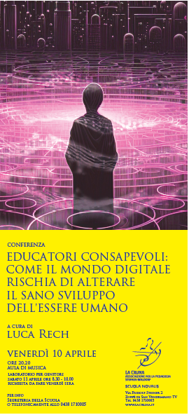 La Cruna Associazione per la pedagogia Steiner Waldorf organizza per venerdì 10 aprile alle ore 20.20 una conferenza dal titolo "Educatori consapevoli: come il mondo digitale rischia di alterare il sano sviluppo dell'essere umano", a cura di Luca Rech, ricercatore indipendente.