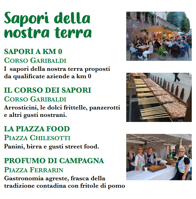 - Profumo di Campagna (Piazza Ferrarin): gastronomia agreste e tradizione contadina con fritole di pomo