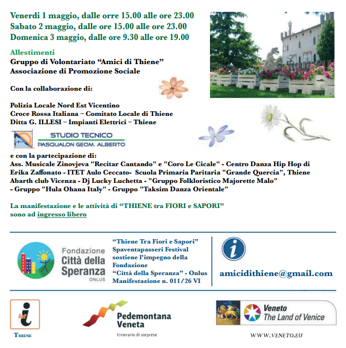 Per ulteriori informazioni visitare il seguente link: https://myportal-cl157.regione.veneto.it/home/dettaglio/eventi/thiene-tra-fiori-esapori-maggio-1-3