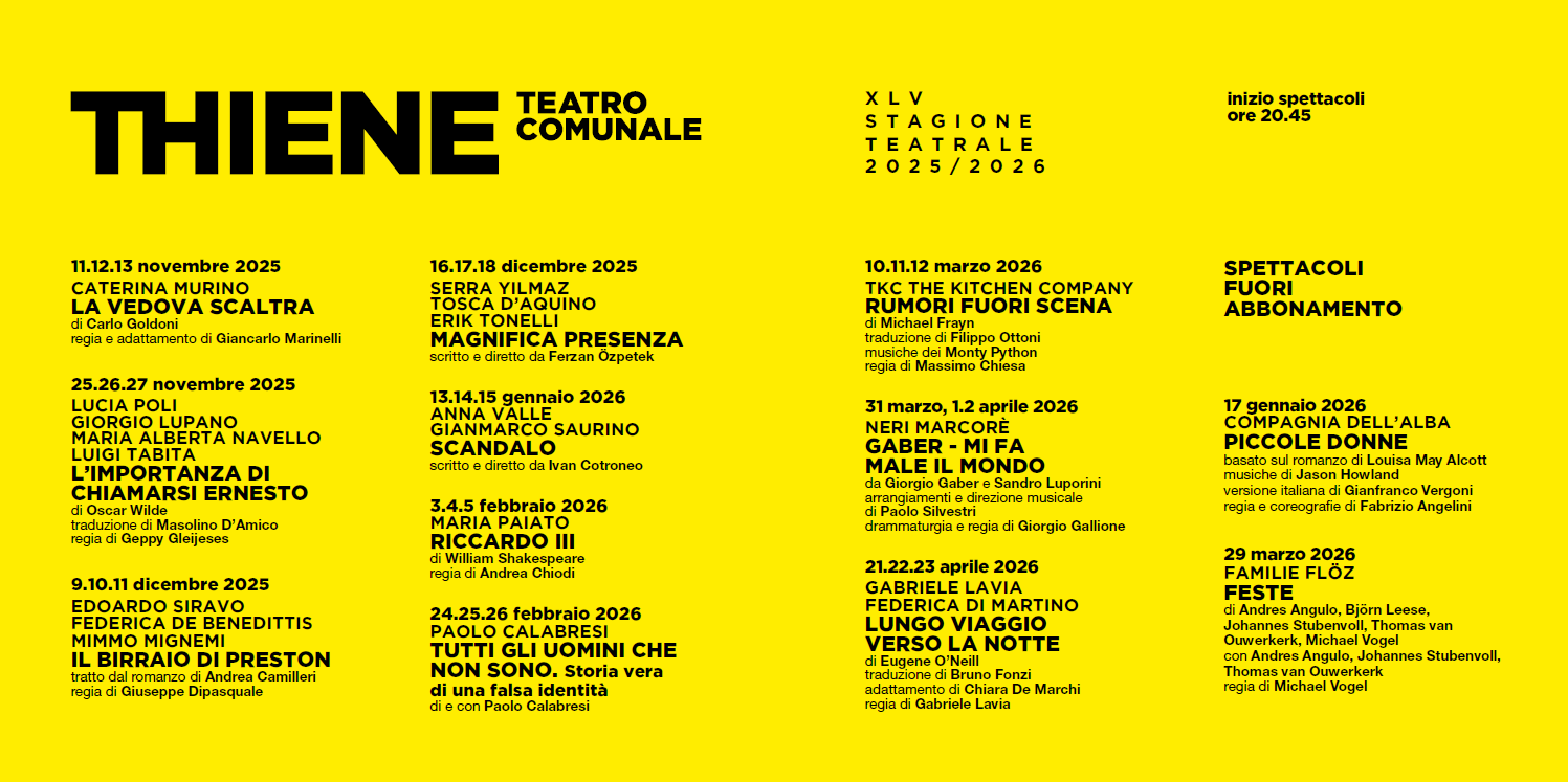 La XLV Stagione Teatrale 2025/2026 del Teatro Comunale di Thiene, organizzata dall'Ufficio Cultura del Comune di Thiene.