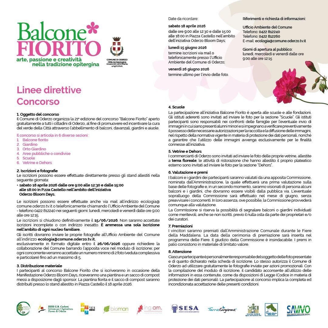 Il Comune di Oderzo – Ufficio Ambiente promuove la 21ª edizione del concorso “Balcone Fiorito”, un’iniziativa aperta gratuitamente a tutti i cittadini con l’obiettivo di valorizzare e incentivare la cura del verde urbano attraverso l’abbellimento di balconi, davanzali, giardini, orti e spazi condivisi.
