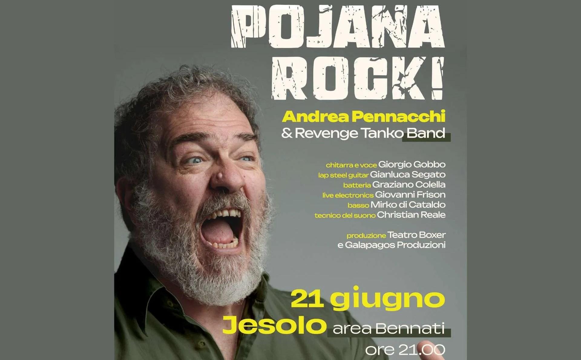 A Jesolo irrompe Andrea Pennacchi. In Pojana Rock! Il suo inconfondibile teatro incontra la musica della Revenge Tanko Band capitanata da Giorgio Gobbo e l’iconico spettacolo Pojana e i suoi fratelli si amplifica di nuovi significati e suggestioni. C’è un suono che rimbomba nei capannoni vuoti del Nordest. È un suono ruvido, elettrico, carico di storie. Lo spettacolo porta lo spettatore dentro un mondo fatto di imprenditori disillusi, sicurezza privata, schei e paranoia. Storie che fanno ridere e fanno male, che vibrano tra parole e riff distorti, tra il rombo di un basso e il sarcasmo di chi conosce bene la terra da cui viene.