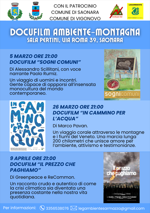 Il Circolo Legambiente “La Sarmazza” – Montagna Viva, con il patrocinio dei Comuni di Vigonovo e Saonara, propone una rassegna di docufilm dedicata ai temi dell’ambiente, del territorio e della responsabilità collettiva.