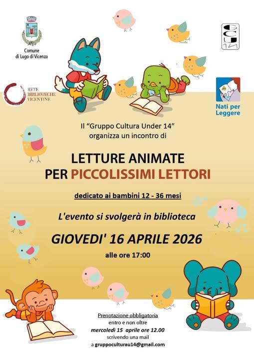 Giovedì 16 aprile 2026 alle ore 17.00, presso la Biblioteca di Lugo di Vicenza, si terranno delle Letture animate per piccolissimi lettori, dedicato a bambini dai 12 ai 36 mesi, organizzato dal Gruppo Cultura u14 con il patrocinio del Comune di Lugo di Vicenza.