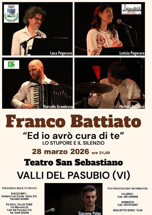 Sabato 28 marzo 2026 alle 21:00 si terrà "Ed io avrò cura di te" al Teatro San Sebastiano di Valli del Pasubio, presentato da Luca Pegoraro Quintet.