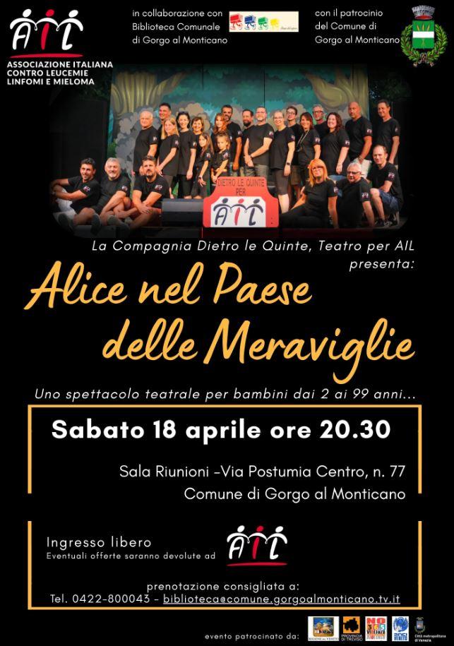 La Compagnia Dietro Le Quinte, Teatro per AIL, presenta sabato 18 aprile alle ore 20.30 lo spettacolo teatrale ALICE NEL PAESE DELLE MERAVIGLIE in Sala Riunioni del Comune di Gorgo al Monticano.