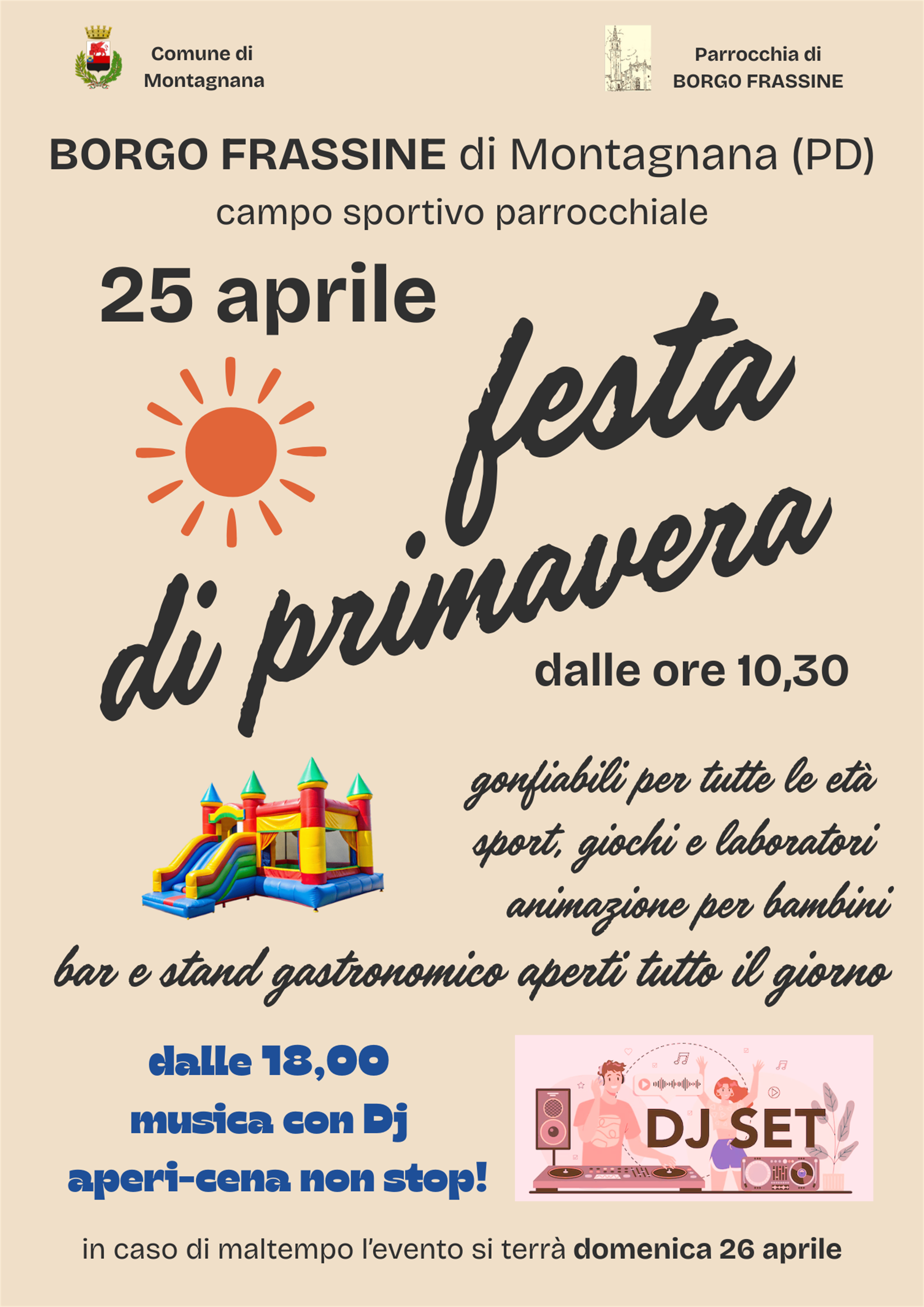 Nel campo sportivo parrocchiale di Borgo Frassine intrattenimento per grandi e piccini, giochi, laboratori, animazione, bar e stand gastronomico aperti tutto il giorno. In caso di maltempo l'evento si terrà domenica 26 aprile.