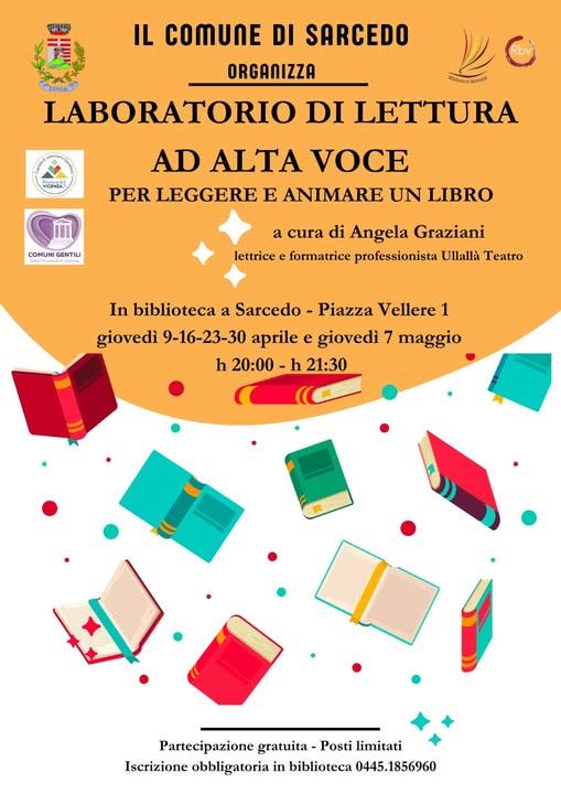 Giovedì 9, 16, 23, 30 aprile e giovedì 7 maggio 2026 dalle 20.00 alle 21.30 si terrà presso la Biblioteca di Sarcedo, l'evento Laboratorio di Lettura ad Alta Voce, organizzato dal Comune di Sarcedo.