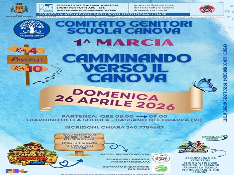 Prima edizione della marcia “camminando verso il Canova” che si terrà domenica 26 aprile 2026, con partenza dalla scuola primaria Canova a Bassano del Grappa.
