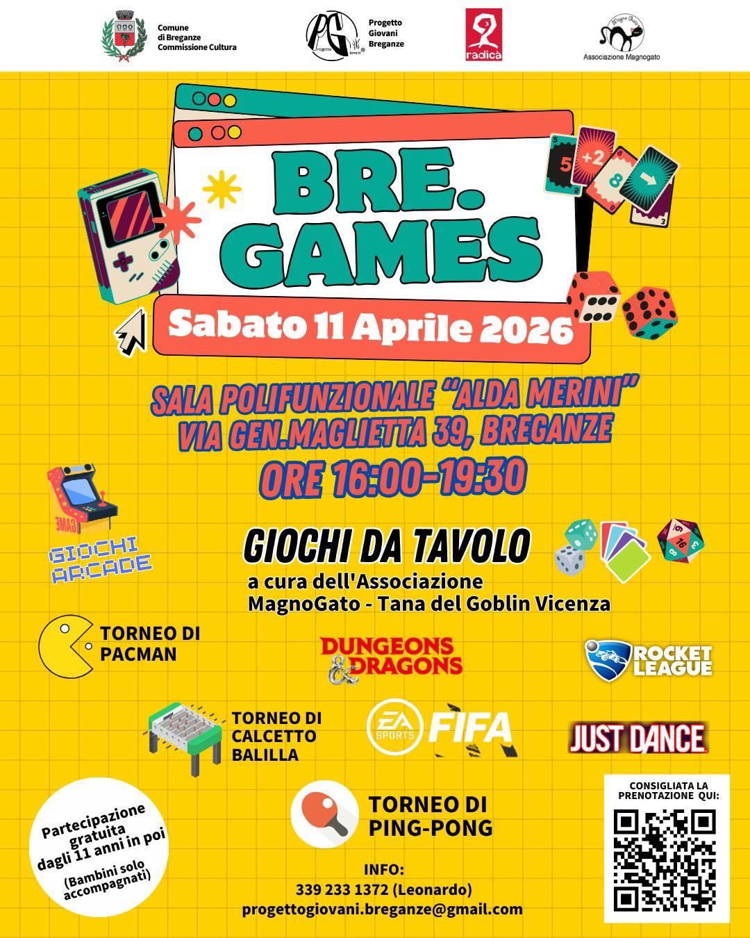 Sabato 11 Aprile 2026 dalle ore 16:00 alle ore 19:30 si terrà "Bre. Games" presso la Sala Polifunzionale "Alda Merini" del comune di Breganze.