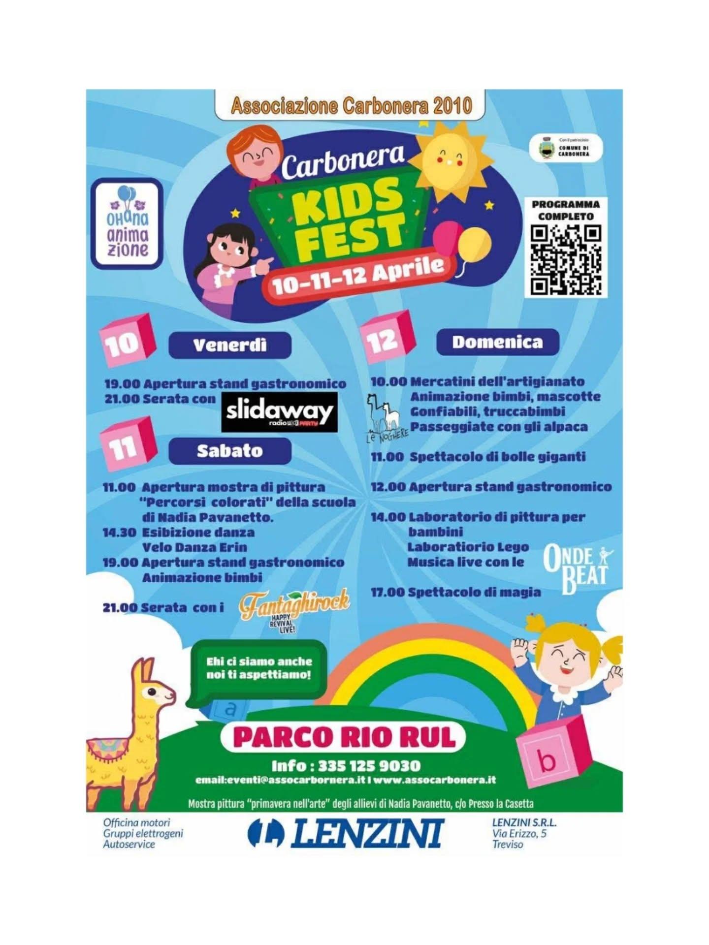 Dal 10 al 12 aprile il Parco Rio Rul di Carbonera ospita il “Carbonera Kids Fest”, un evento dedicato a bambini e famiglie con un ricco programma di attività tra divertimento, laboratori e spettacoli.