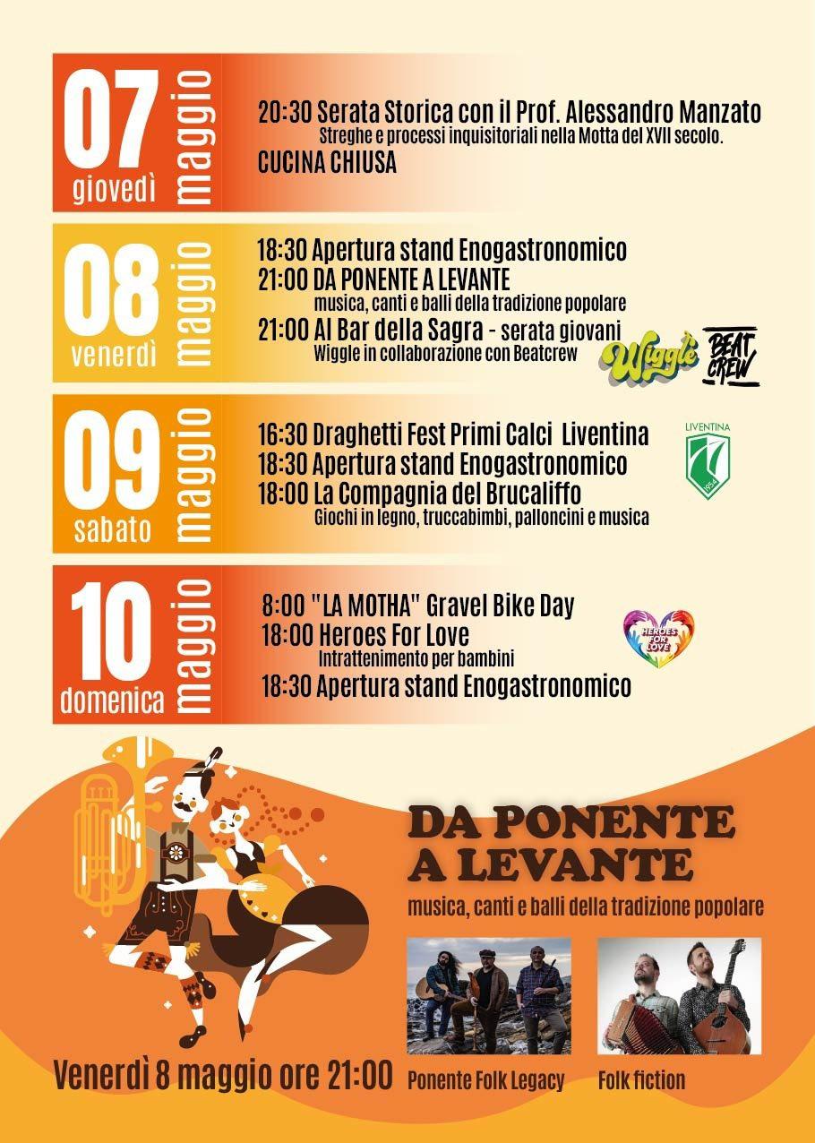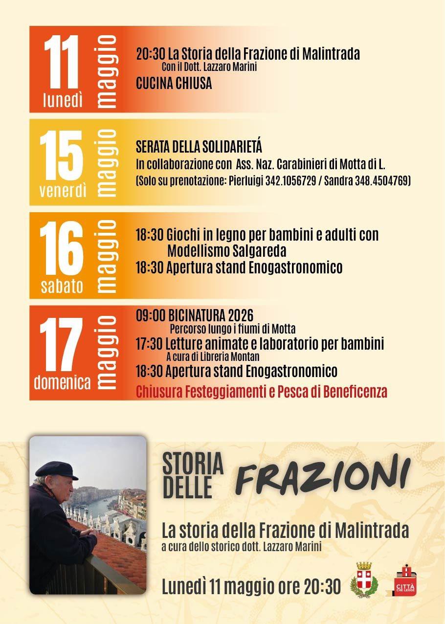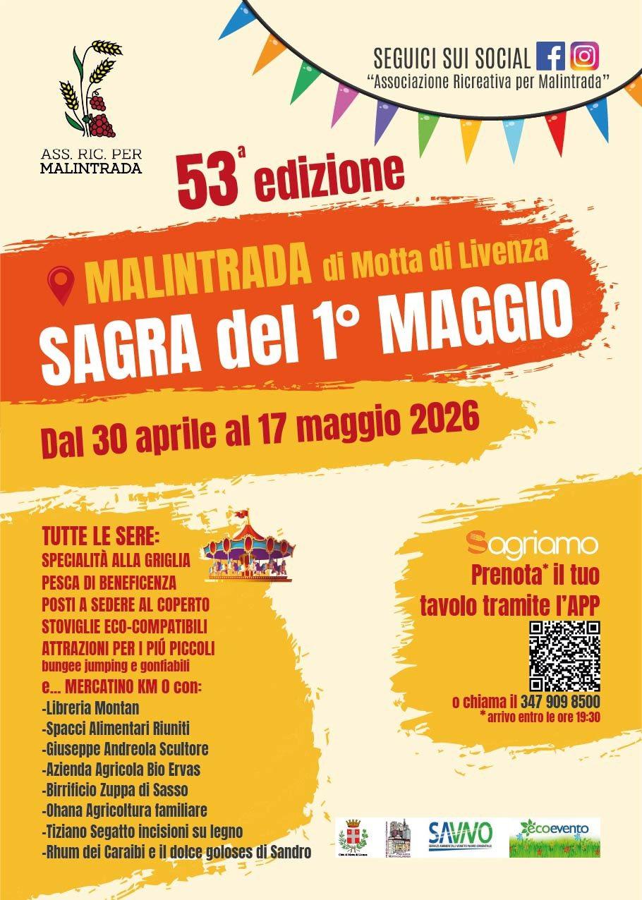 Dal 30 aprile al 17 maggio 2026 torna a Malintrada di Motta di Livenza la tradizionale Sagra del 1° Maggio, giunta alla 53ª edizione, un appuntamento che unisce momenti di intrattenimento, cultura, enogastronomia e attività per tutte le età.