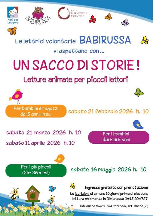 Da febbraio a maggio 2026, alle ore 10:00, presso la Biblioteca civica di Thiene, si terrà "Un sacco di storie", organizzato dal Comune di Thiene.