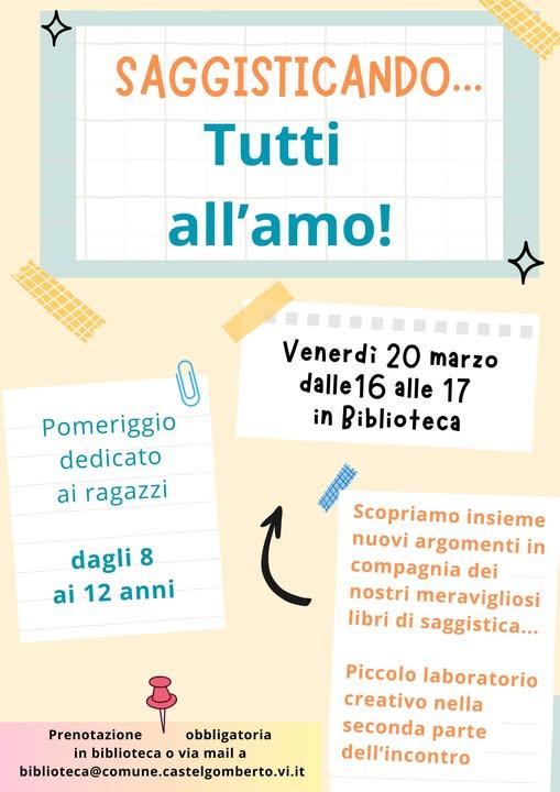 Venerdì 20 marzo 2026, si terrà, dalle ore 16:00 alle ore 17:00, presso la Biblioteca di Castelgomberto, Saggisticando... tutti all'amo!, a cura della Biblioteca Comunale di Castelgomberto.