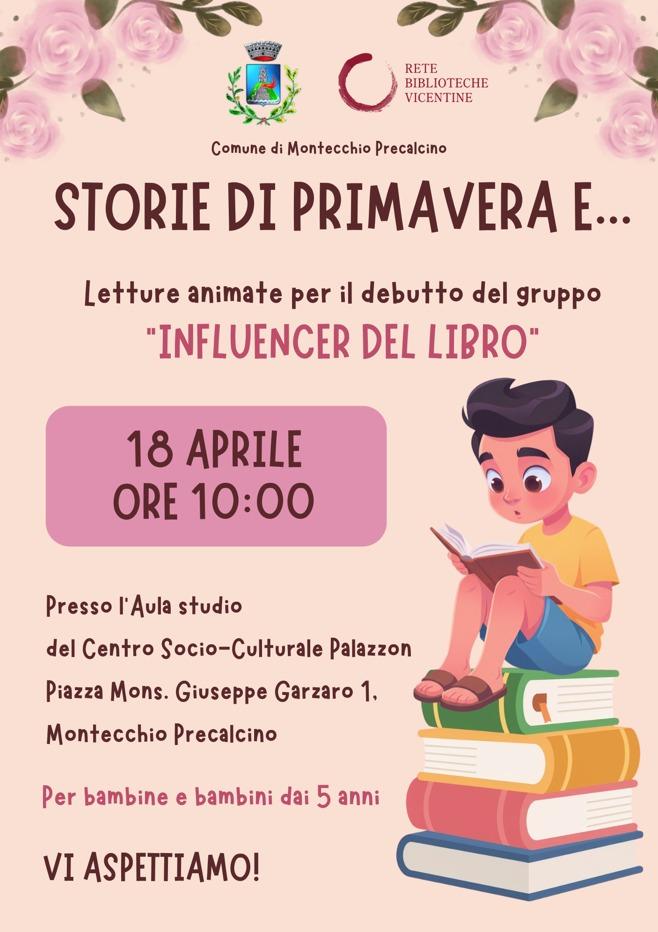 Sabato 18 aprile 2026 alle ore 10:00 presso l'Aula studio del Centro Socio-Culturale Palazzon di Montecchio Precalcino, ci saranno letture animate per il debutto del gruppo "Influencer del Libro" per bambine e bambini dai 5 anni.