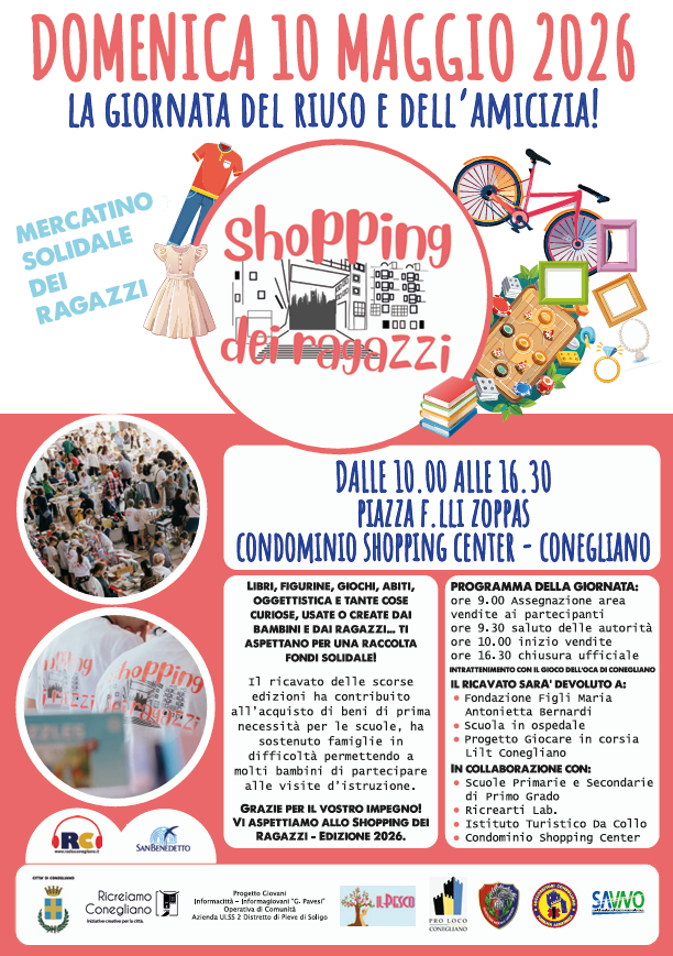 Domenica 10 maggio 2026 dalle ore 10.00 alle ore 16.30 si tiene la terza edizione dello Shopping dei Ragazzi, La giornata del riuso e dell’ amicizia.