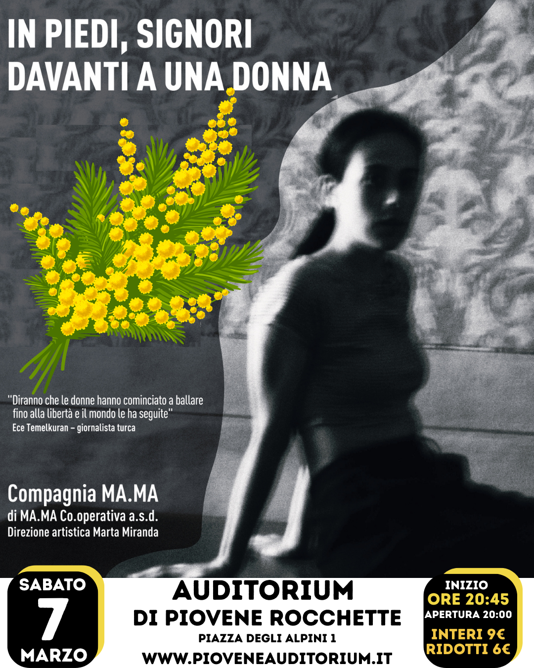 Sabato 7 Marzo 2026, si terrà, alle ore 20:45, presso la l'Auditorium di Piovene Rocchette, In piedi, signori, davanti a una donna, con la compagnia MA.MA di MA.MA Co.operativa a.s.d.