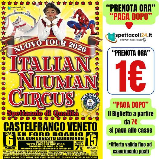 Preparatevi a vivere un’esperienza indimenticabile: l'Italian Niuman Circus arriva in città per trasportare grandi e piccini in un mondo fatto di sogni, prodezze e risate. Sotto il grande tendone, la tradizione circense incontra l'innovazione in uno show che promette di lasciarvi a bocca aperta.