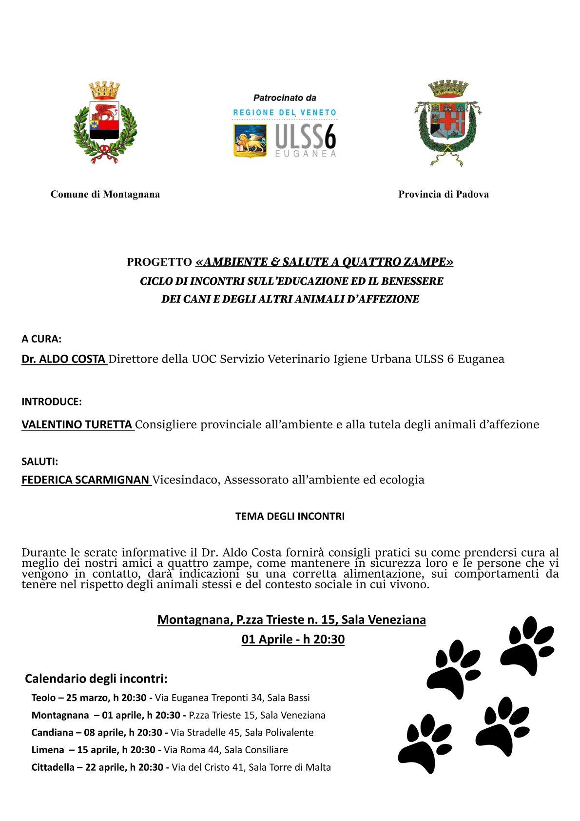 A cura di Aldo Costa, Direttore della UOC Servizio Veterinaio Igiene Urbana ULSS 6 Euganea. Introduce Valentino Turetta, Consigliere Provinciale all'ambiente e alla tutela degli animali d'affezione. Saluti di Federica Scarmignan, Vicesindaco e Assessorato all'ambiente ed ecologia.