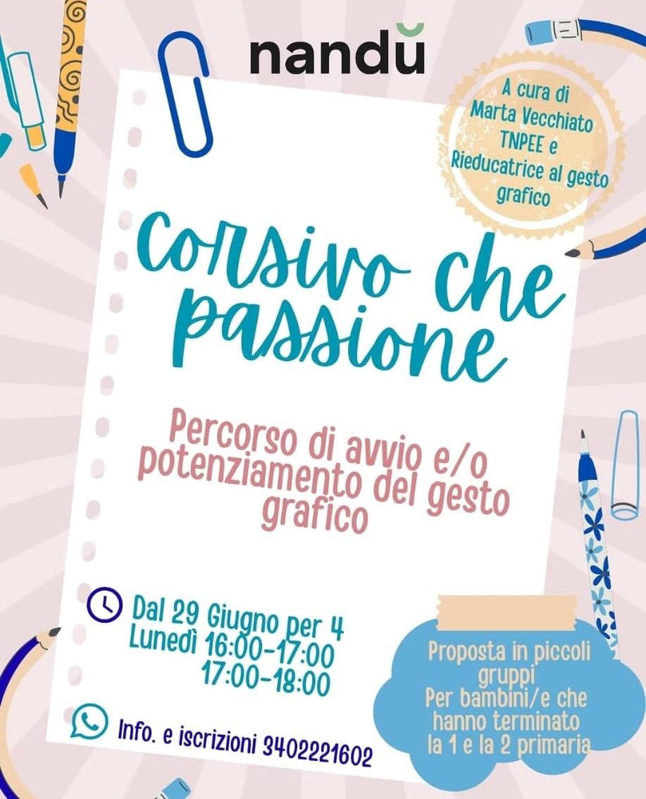 L'associazione Nandù propone "Corsivo che passione", un percorso dedicato all'avvio e al potenziamento del gesto grafico per i bambini che hanno appena terminato la prima o la seconda classe della scuola primaria. Curato da Marta Vecchiato, TNPEE e rieducatrice della scrittura, il corso mira a rendere la scrittura manuale un'abilità fluida e piacevole attraverso piccoli gruppi di lavoro che garantiscono attenzione a ogni partecipante. Gli incontri si terranno per quattro lunedì consecutivi, con turni pomeridiani organizzati per fasce orarie. È un'ottima opportunità estiva per consolidare le basi della scrittura in modo sereno e mirato, trasformando il segno grafico in uno strumento di espressione sicuro ed efficace.