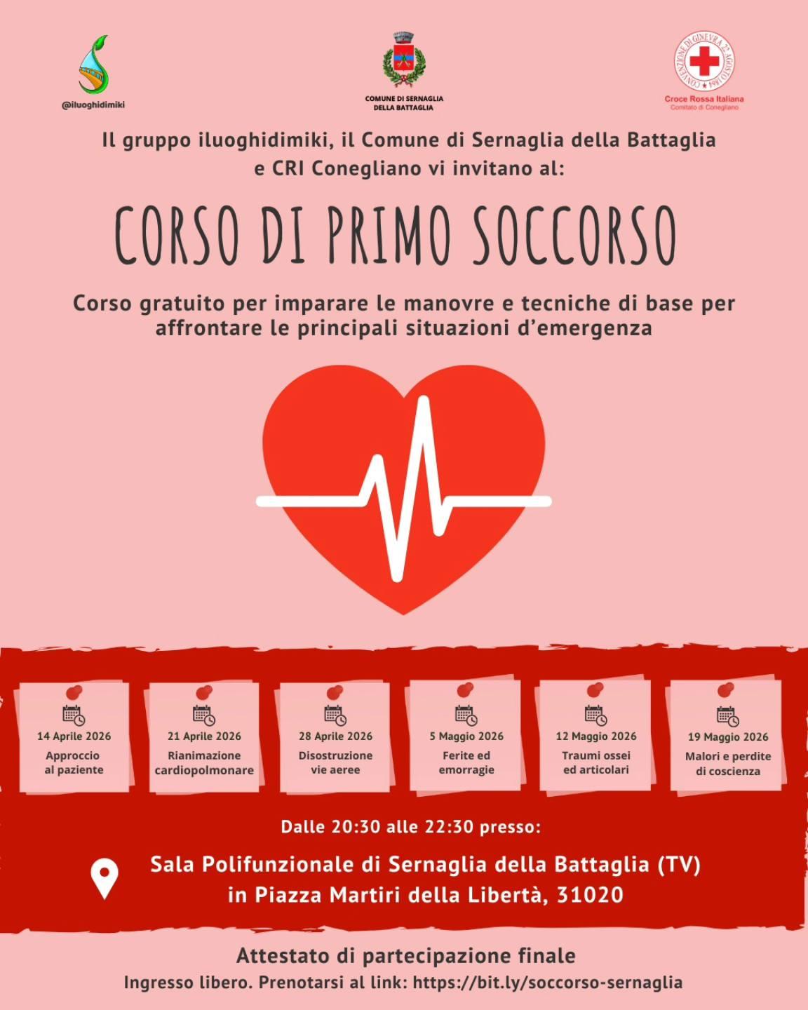 Il gruppo "I luoghi di Miki", in collaborazione con il Comune di Sernaglia e con CRI Conegliano, organizza un corso gratuito di primo soccorso.