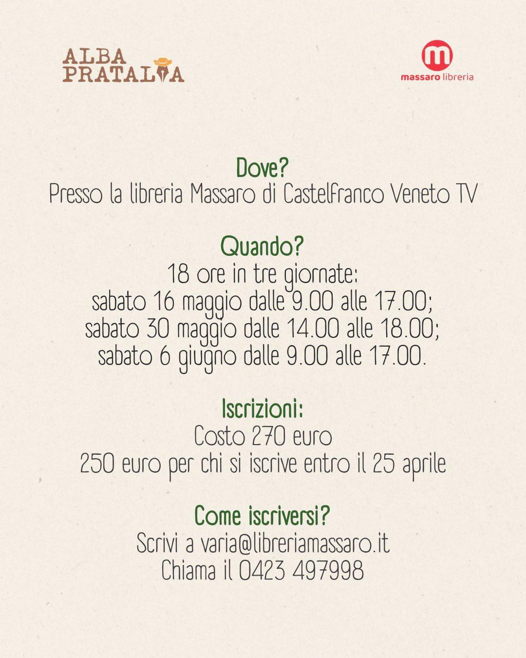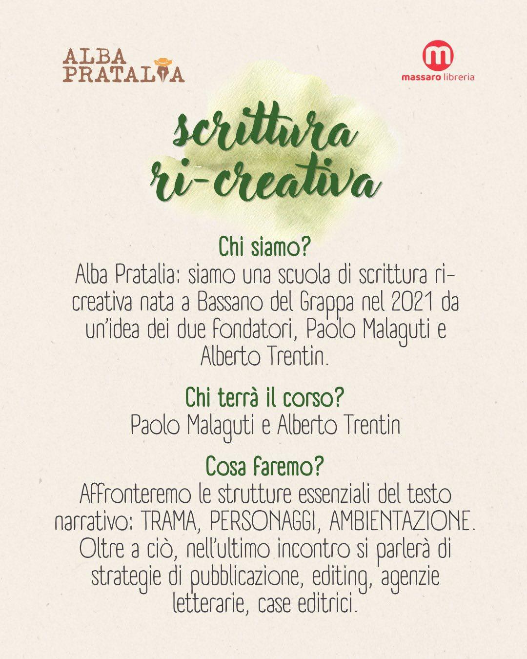 Il corso di scrittura ri-creativa proposto dalla scuola Alba Pratalia si terrà a Castelfranco Veneto presso la Libreria Massaro, sotto la guida esperta dei fondatori Paolo Malaguti e Alberto Trentin.
