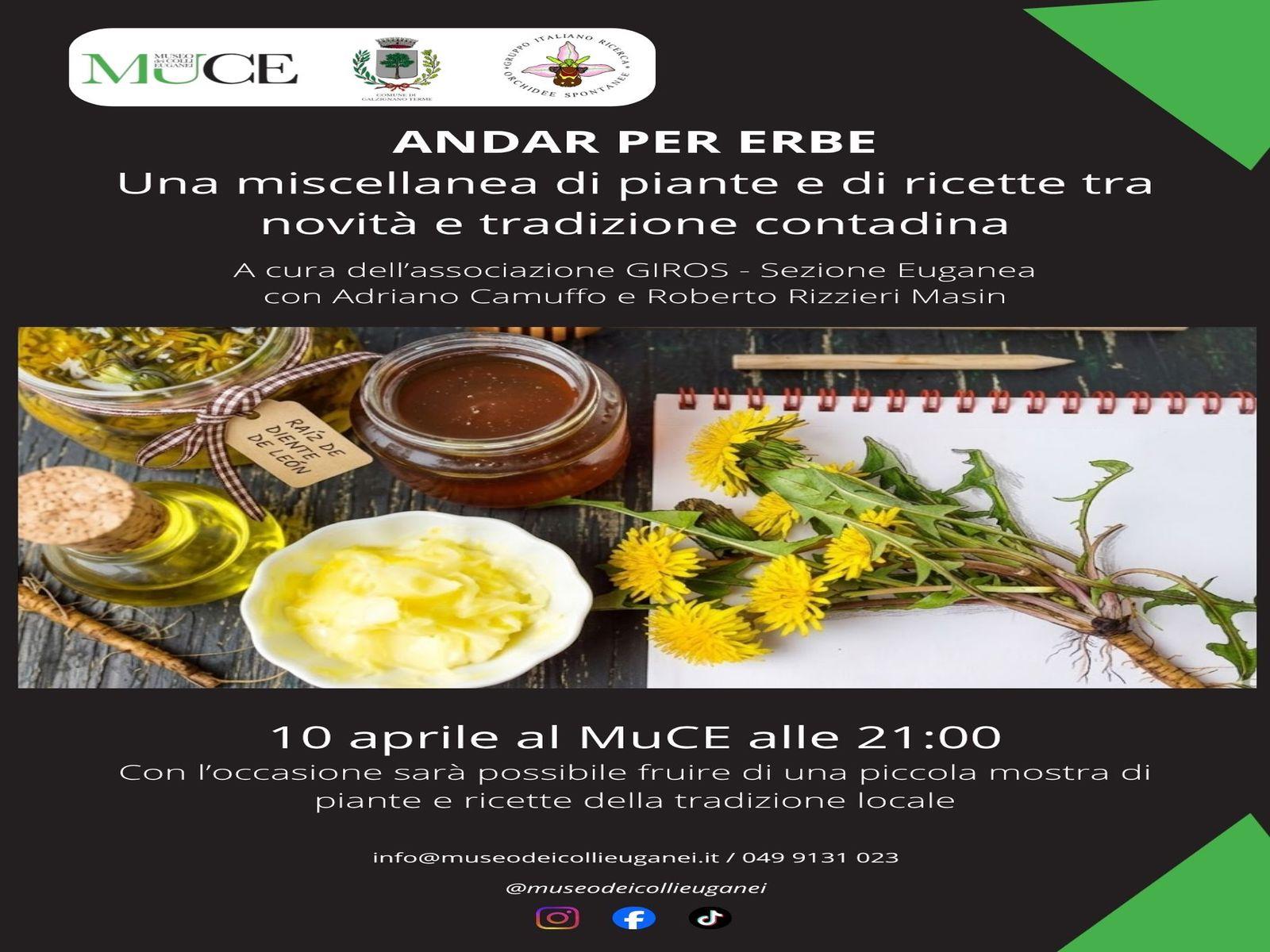 A cura dell’associazione GIROS – sezione Euganea, con Adriano Camuffo e Roberto Rizzieri Masin, “Andare per erbe” è un incontro dedicato alla conoscenza e alla valorizzazione delle piante spontanee e della tradizione locale. L’iniziativa propone il racconto con esperti di una miscellanea di piante e di ricette tra novità e tradizione contadina. In occasione dell’evento sarà inoltre possibile visitare una piccola mostra di piante e ricette legate alla cultura del territorio. Ingresso libero fino ad esaurimento posti.