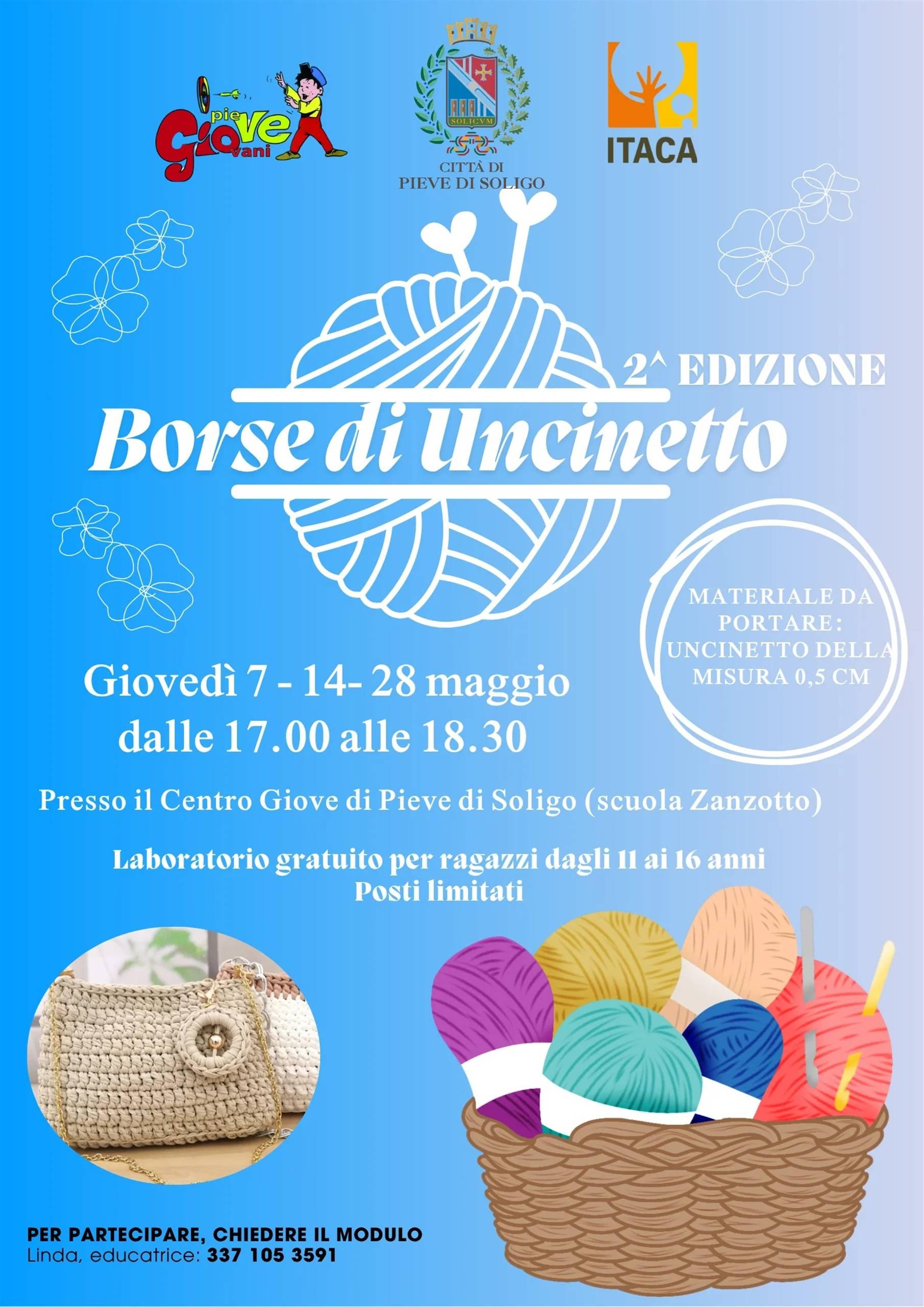 La Città di Pieve di Soligo, con la collaborazione della Cooperativa Itaca, organizza la seconda edizione del laboratorio gratuito per la realizzazione di "Borse di Uncinetto", per ragazzi dagli 11 ai 16 anni, presso il Centro Giove di Pieve di Soligo (scuola Zanzotto), nei giorni 7-14 e 28 maggio, dalle ore 17.00 alle ore 18.30.