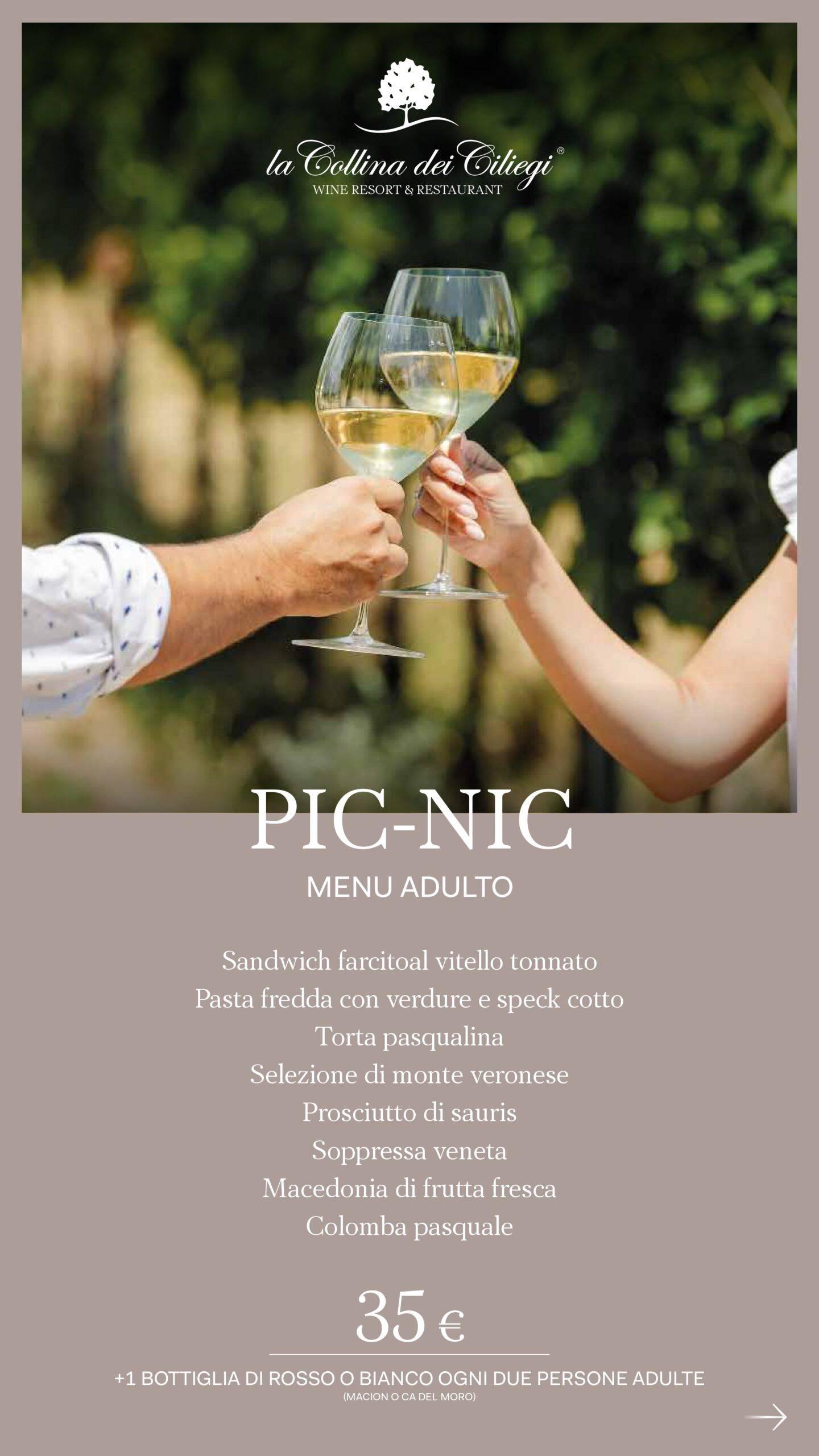 - Menù Adulto (35 €+1 bottiglia di rosso o bianco Macion o Ca del Moro ogni due persone adulte): Sandwich al vitello tonnato, pasta fredda con verdure e speck cotto, torta pasqualina, selezione di monte veronese, prosciutto di sauris, soppressa veneta, macedonia di frutta fresca, colomba pasquale.