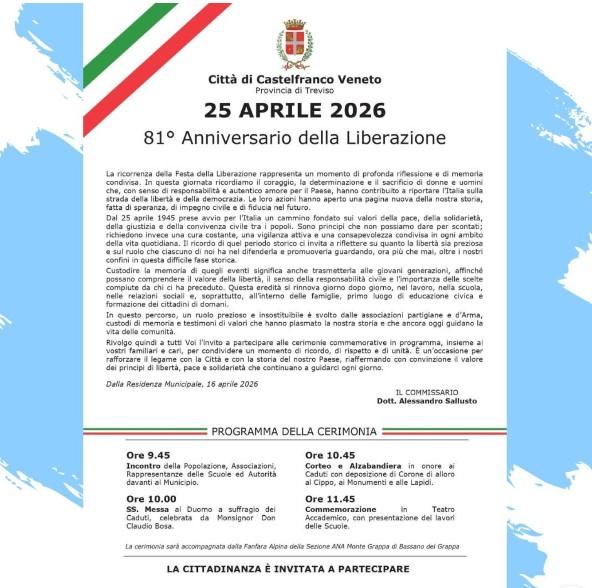 In occasione dell'81° Anniversario della Liberazione, la Città di Castelfranco Veneto organizza per sabato 25 aprile 2026 una giornata di commemorazione e riflessione istituzionale.