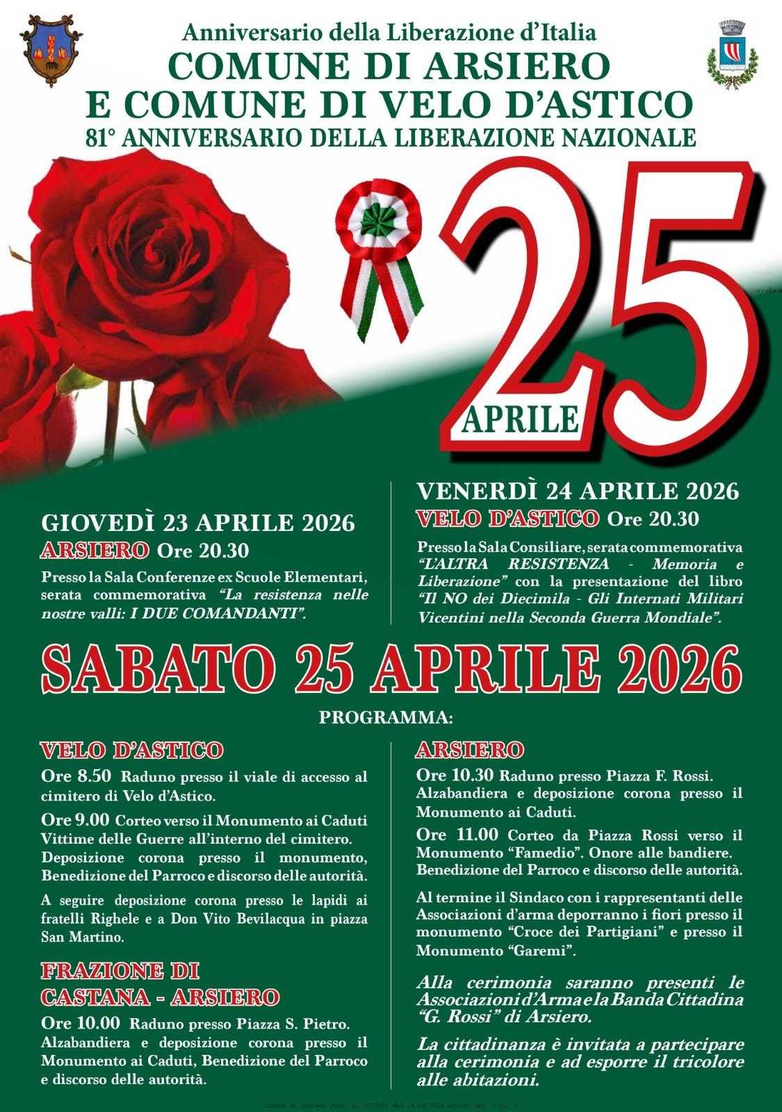 A partire da giovedì 23 aprile fino a sabato 25 aprile 2026, ci saranno una serie di incontri presso i Comuni di Arsiero, Velo d'Astico e la frazione di Castana in riferimento all'81^ anniversario della liberazione nazionale.